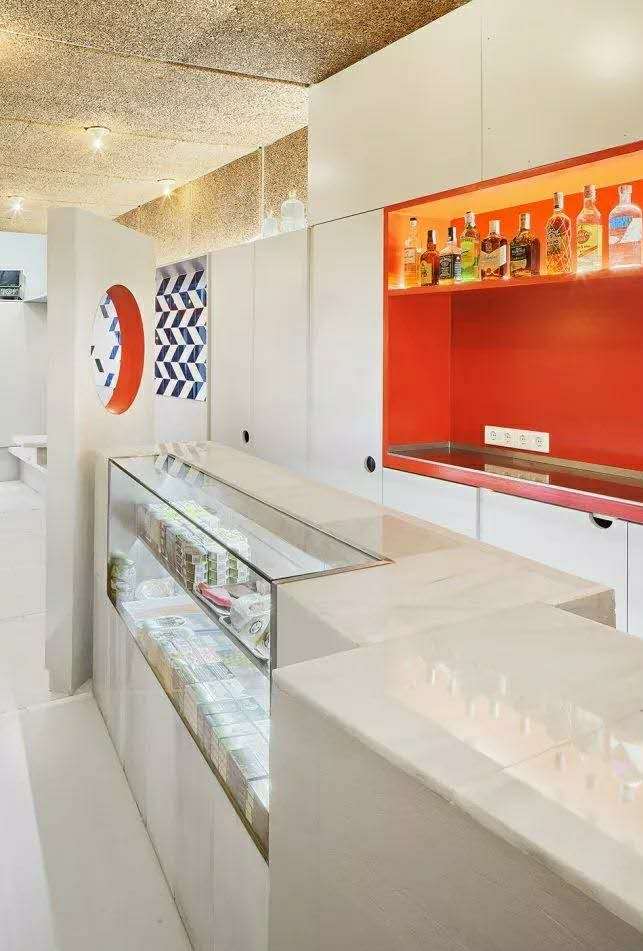考慮到公共場(chǎng)所的聲學(xué)要求,室內(nèi)天花板和部分側(cè)面已經(jīng)覆蓋了軟木面板,這是一種吸音材料,因此可以避免混響,也可以減少對(duì)鄰居的干擾。軟木飾面的塑料品質(zhì)被用作建筑的主要裝飾主題。這種材料其切割產(chǎn)生的條紋在原處和放置天花板的地方制造出韻律感,使得燈泡看起來像是懸浮著。在這個(gè)天花板上制作了一系列凹洞,突出了內(nèi)部的節(jié)奏,并尋求一種自然天頂照明的感覺。大部分的墻壁都有輔助工作條,與內(nèi)襯藍(lán)白相間的斜面瓷磚和白色瓷磚相一致。折疊屏風(fēng)、吧臺(tái)、高腳椅和桌子,每一種元素的奇異性賦予酒吧每個(gè)部分不同的性質(zhì),為尋找不同風(fēng)格座位的顧客創(chuàng)造不同的氛圍。