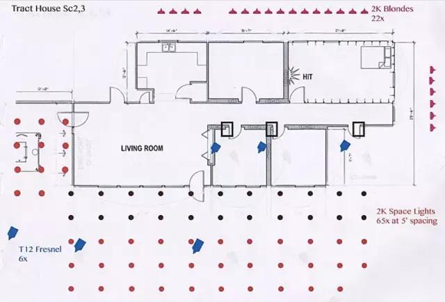 Deakins: 我的圖只是粗略的設計,只是用來和我的燈光師溝通,看哪里需要什么燈。T12和天空燈是事先安裝好的,但這些燈不是用來照演員臉的,T12沒法照那么遠。