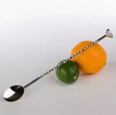 長(zhǎng)匙的兩端功能是不一樣的,一端是叉狀,一般用來(lái)叉取櫻桃檸檬等;另一端為匙,用來(lái)攪拌混合雞尾酒原料,而匙的容量一般為一茶匙。這種是比較簡(jiǎn)單的工具,一般家中可以湯匙代替即可。