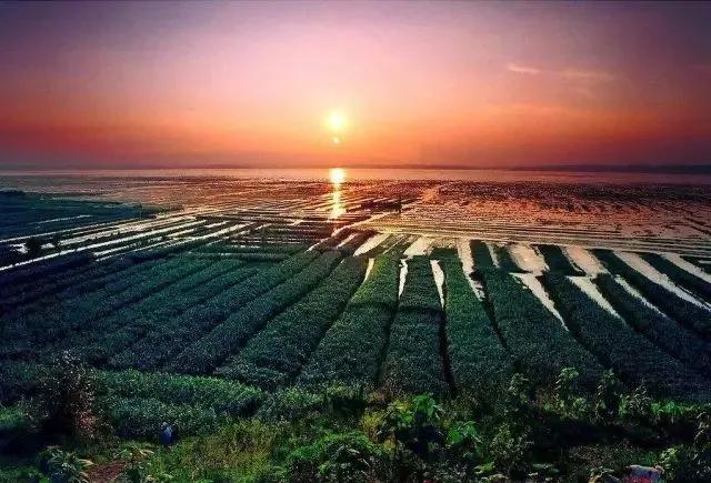 傍晚時分,林木茂密,水天一色,翠峰鵠立,湖中白帆點點,波光粼粼,一片寧靜淡泊的世外桃源景象。
