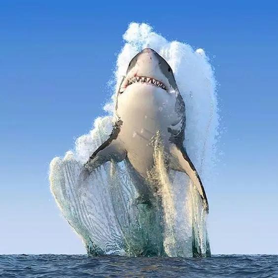 大白鯊從海里一躍而起,身體激起巨大的浪花,這樣的鯊魚看上去一點都不可怕反而很可愛。