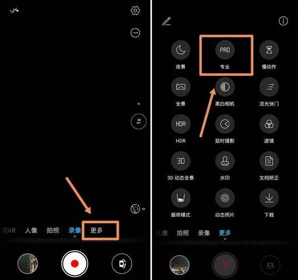 打開(kāi)相機(jī)后,在主界面下面有個(gè)“更多”,我們點(diǎn)擊后界面上就會(huì)多出許多選項(xiàng),第二個(gè)就是“專(zhuān)業(yè)”模式(各個(gè)型號(hào)的專(zhuān)業(yè)模式方法開(kāi)啟來(lái)不一樣,大家如果找不到,可自行搜索自己手機(jī)的打開(kāi)方式)。