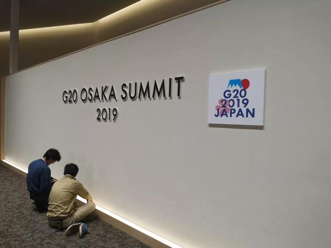 大阪麗嘉皇家酒店內(nèi),帶有二十國集團(tuán)領(lǐng)導(dǎo)人大阪峰會會標(biāo)的迎賓牌格外醒目。