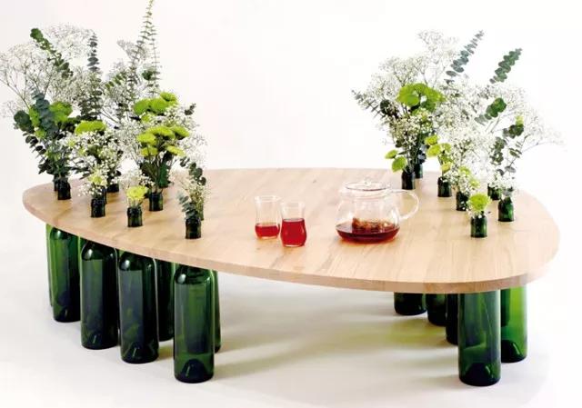 比如這個矮桌,在模板上鉆幾個洞,酒瓶作為桌腳,還能在酒瓶上插上花。盤腿坐在花叢之間品啜香茗,實(shí)在美好。