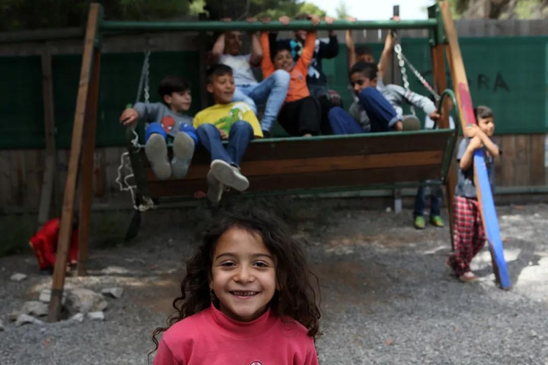 2018 年4 月12日,在希臘雅典以北約 86 公里處的里措納難民營,兒童在秋千上玩耍。歐盟委員會主管移民、內(nèi)部事務(wù)與公民事務(wù)的委員阿夫拉莫普洛斯 12 日在視察雅典附近一座難民營時表示,歐盟將繼續(xù)幫助希臘、意大利等處于難民問題前沿的國家。