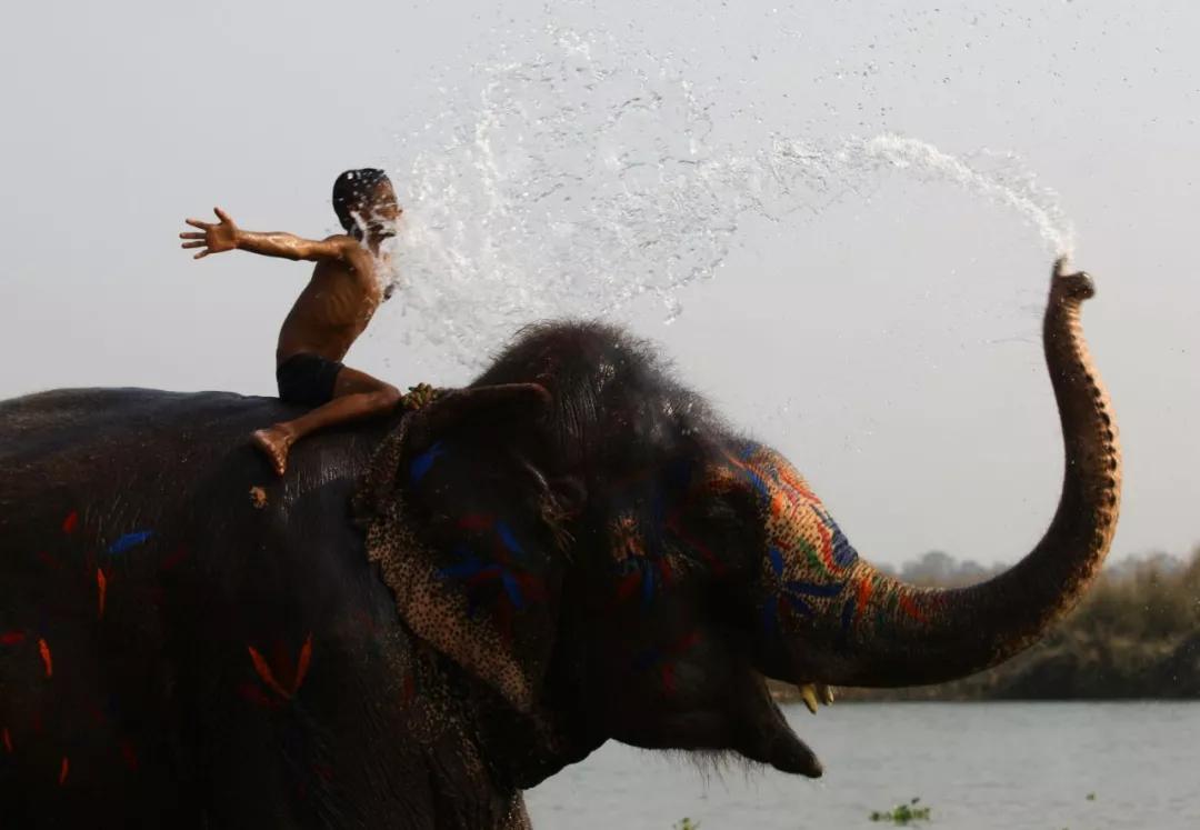 2018 年12月27日,在尼泊爾奇特旺,一名兒童在大象節(jié)上和大象戲水。第十五屆尼泊爾大象節(jié)正在奇特旺的索拉哈鎮(zhèn)舉行,活動旨在推廣當(dāng)?shù)芈糜螛I(yè)并增強人們對野生動物的保護(hù)意識。