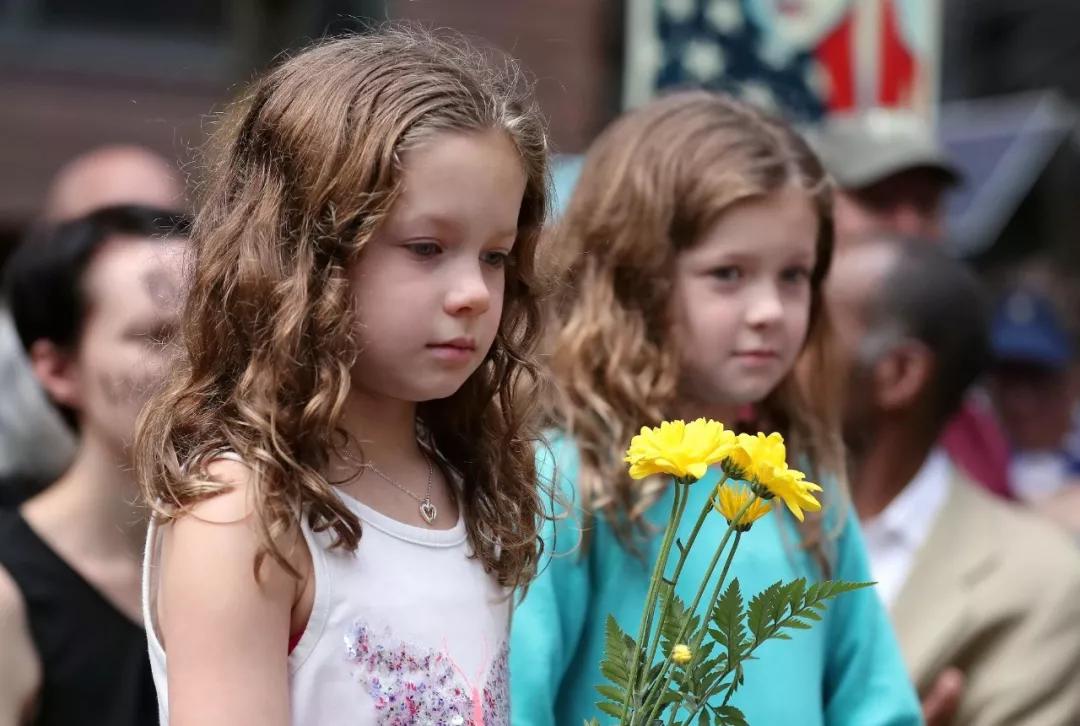 2017 年8月13日,在美國芝加哥,一名小女孩手持鮮花參加紀(jì)念活動。數(shù)百名芝加哥市民13日聚集在市中心的聯(lián)邦廣場,為美國弗吉尼亞州夏洛茨維爾市暴力事件受害者舉行紀(jì)念活動。