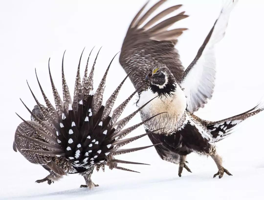 照片背后的故事:“我用了很多個春天寒冷的早晨來拍攝大艾草松雞求偶的場景。一開始,照片中的這兩只競爭者肩并肩地坐在一起,突然之間,它們仿佛收到了某種暗號,開始用翅膀向?qū)Ψ桨l(fā)起攻擊。這張在堅硬的積雪地上抓到的照片,展示了大艾草松雞為了求偶打架時的力量。”