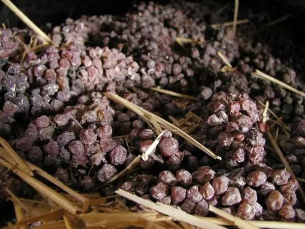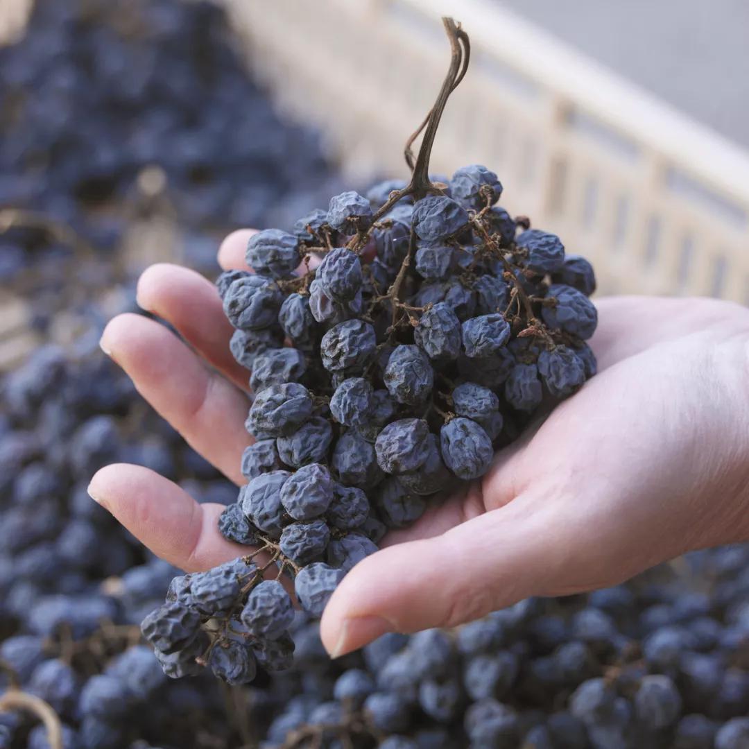 風(fēng)干后壓榨通常在1月進(jìn)行,出汁率極低(100公斤只能出20升葡萄汁)。