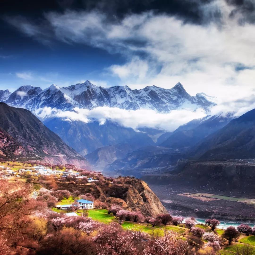 盛開(kāi)的桃花依偎在高聳入云的雪峰之下