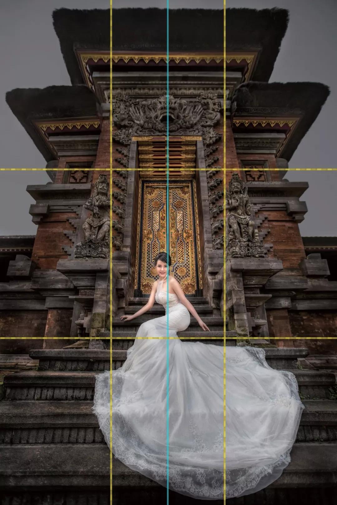 但其實這也是借用了建筑物的線條引導(dǎo),將觀者注意力從前景延伸到背景,又或者從背景過渡到畫面主體(藍(lán)色線為對稱參考線)。