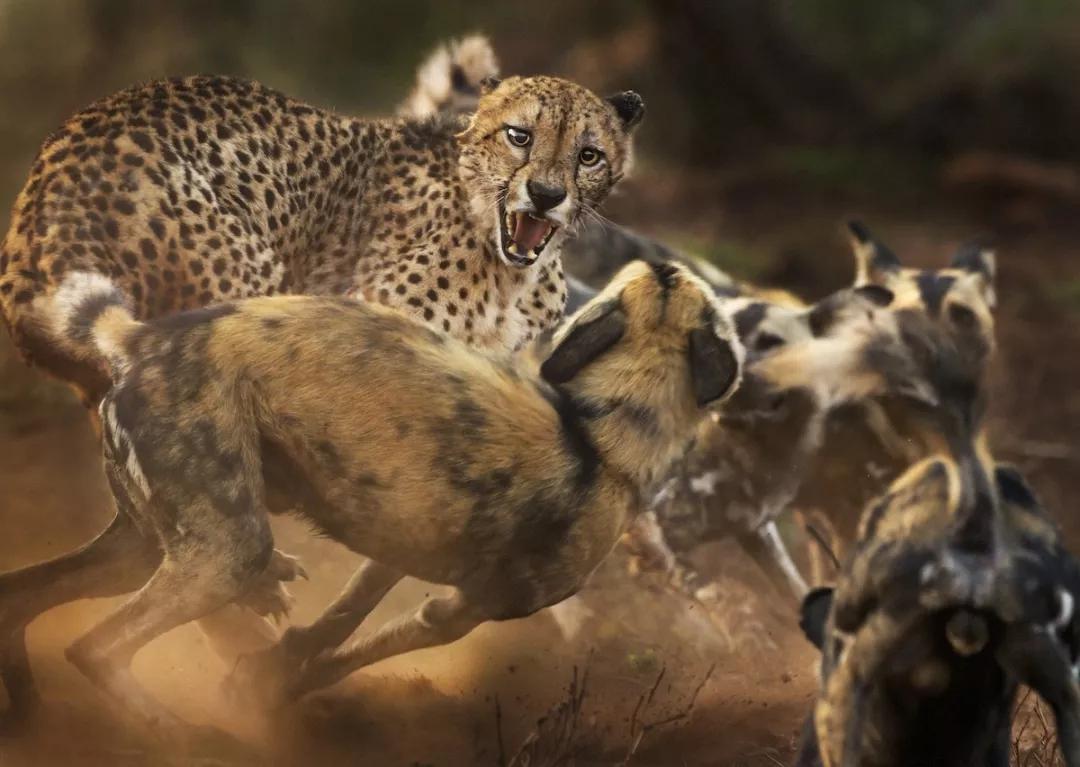 這只上了年紀(jì)的獵豹發(fā)出一邊發(fā)出“嘶嘶”地叫聲,一邊蓄力向這群野狗發(fā)起攻擊,它的左耳在打斗中被咬破,右耳在喧鬧的聲中緊緊壓下。攝影師 Peter 的鏡頭緊緊地跟著獵豹的臉,拍下了這場罕見的相遇。(由于棲息地的流失和被破壞,這兩個物種都已經(jīng)從他們大部分曾經(jīng)的棲息地中消失。)