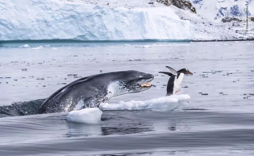 一只巴布亞企鵝正在一塊碎冰上小憩,突然間一只豹海豹從水面中沖出,長著大嘴,攻向這只企鵝。巴布亞企鵝已經(jīng)是企鵝屆中游泳速度最快的選手了,它慌忙從碎冰上逃脫,但是在后面不慌不忙追趕的豹海豹此時似乎已經(jīng)將這場捕獵當(dāng)成了自己的游戲。