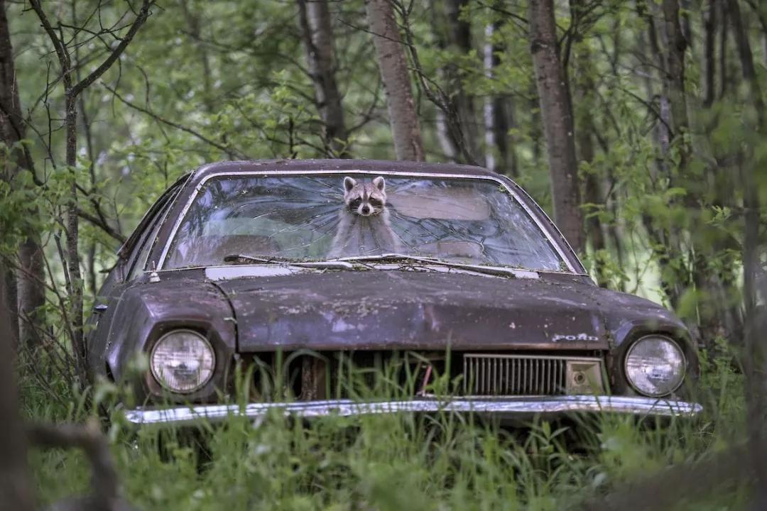 傍晚時分,在加拿大薩斯喀徹溫省的一個廢棄農(nóng)場里,一只浣熊將頭從一輛二十世紀(jì)七十年代福特的擋風(fēng)玻璃的碎洞中探出,而后座上正坐著它五個興奮的孩子。這位浣熊母親將頭探出后,仔細(xì)觀察了周圍環(huán)境很久,在確定安全以后,它趁著夜色鉆出了這輛車去為孩子們尋找食物。