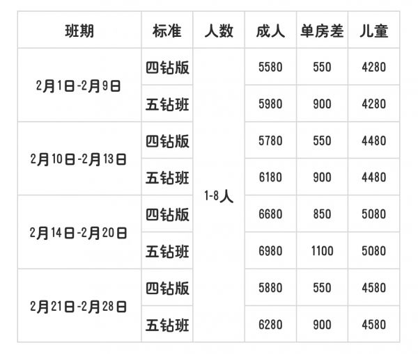 標(biāo)準(zhǔn)價(jià)格: 成人  6980 /人, 兒童  5080 /人