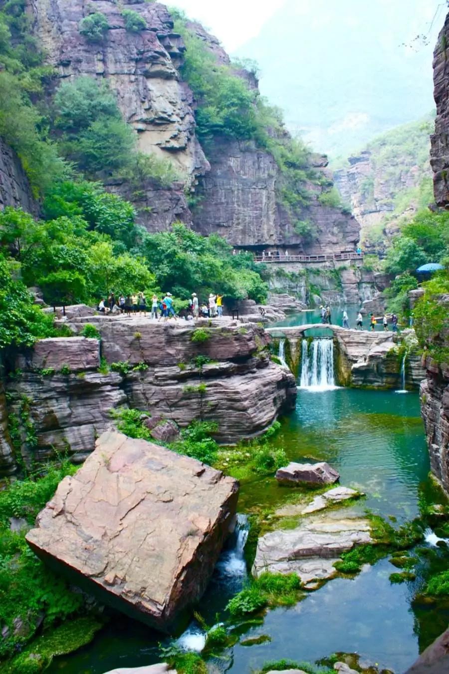 后前往云臺山,自行游覽盆景峽谷——【溫盤峪】(又名紅石峽)。那里集華夏山水與方寸之中;欣賞白龍瀑、黑龍洞、懸石、相吻石、含羞石、天女散化瀑等景觀,觀北方罕見景觀鐘乳石,盡情領(lǐng)略“真山、真水、真空氣”,游覽子房湖, 后游覽云臺山最高峰【茱萸峰】,茱萸峰是歷代文人墨客,僧道修行的圣地,這里植被茂密,古樹參天,有千年名樹紅豆杉,五角楓樹,太行花,森林覆蓋率高達93%,滿山覆蓋的都是原始次生林,有天然氧吧之美譽。踏千階的云梯棧道登上海拔1308米的茱萸峰頂,但見群山連綿,峰涌云動,使人頓生“會當凌絕頂,一覽眾山小”的豪邁氣概。俯視腳下,群峰形似海浪涌。山頂氣候多變,倏忽間風起云生,白霧從山間咕嘟嘟地涌出,紅日隨即隱去。山峰在云霧中出沒,云騰山浮,如臨仙界。玻璃棧道位于云臺山茱萸峰鳳凰嶺景點,在海拔1080米的半山腰上依崖而建?!?strong>玻璃棧道】分為兩段,其中一段沿崖壁呈U型,另一段懸于千米懸崖之上,總長400余米,寬約1.6米。(玻璃棧道體驗費,為20元/人需自理,如遇景區(qū)政策性關(guān)閉,則取消該景點,不另行通知,不退任何費用)