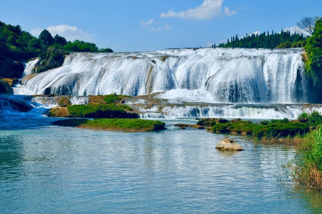 陡坡塘瀑布】位于黃果樹瀑布上游1公里處,瀑頂寬105米,高21米,是黃果樹瀑布群中瀑頂最寬的瀑布。陡坡塘瀑布頂上是一個(gè)面積達(dá)1.5萬平方的巨大溶潭,瀑布則是形成在逶迤100多米長的鈣化灘壩上。