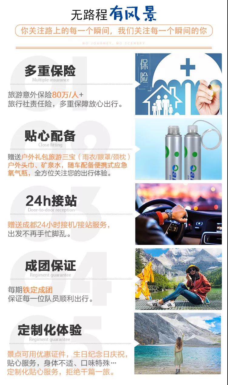 保險(xiǎn):贈(zèng)送旅游意外保險(xiǎn),旅游意外保險(xiǎn)最高賠付80萬(wàn)元/人(外賓另議),購(gòu)買(mǎi)旅行社責(zé)任險(xiǎn);保險(xiǎn)不含財(cái)產(chǎn)險(xiǎn),請(qǐng)游客保管好自己的財(cái)物;因旅行意外造成的客人意外傷害,按保險(xiǎn)公司規(guī)定賠償,我方不承擔(dān)另外的賠償責(zé)任;如游客有需要可自行購(gòu)買(mǎi)其他保障險(xiǎn)。贈(zèng)送:贈(zèng)送旅行三寶(雨衣眼罩和頸枕),緩解旅途疲勞;隨車(chē)配備便攜式應(yīng)急氧氣瓶;贈(zèng)送成都24h接機(jī)接站服務(wù)。贈(zèng)送項(xiàng)目不用費(fèi)用不退。