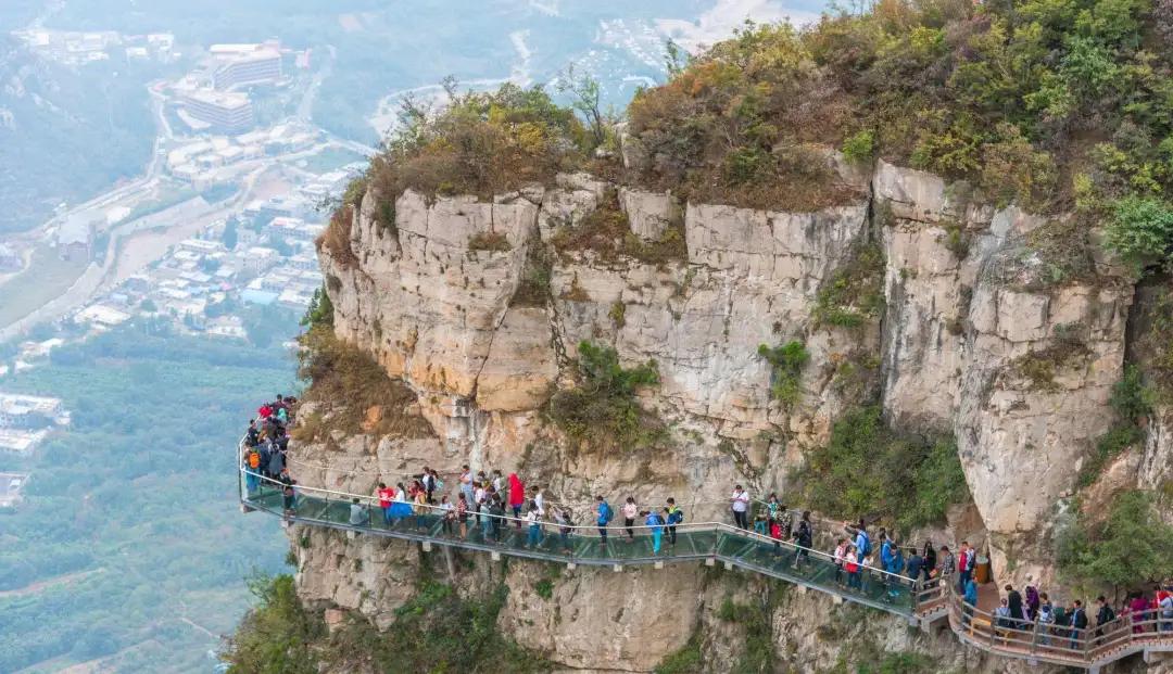 后前往云臺山,自行游覽盆景峽谷——【溫盤峪】(又名紅石峽)。那里集華夏山水與方寸之中;欣賞白龍瀑、黑龍洞、懸石、相吻石、含羞石、天女散化瀑等景觀,觀北方罕見景觀鐘乳石,盡情領(lǐng)略“真山、真水、真空氣”,游覽子房湖, 后游覽云臺山最高峰【茱萸峰】,茱萸峰是歷代文人墨客,僧道修行的圣地,這里植被茂密,古樹參天,有千年名樹紅豆杉,五角楓樹,太行花,森林覆蓋率高達93%,滿山覆蓋的都是原始次生林,有天然氧吧之美譽。踏千階的云梯棧道登上海拔1308米的茱萸峰頂,但見群山連綿,峰涌云動,使人頓生“會當凌絕頂,一覽眾山小”的豪邁氣概。俯視腳下,群峰形似海浪涌。山頂氣候多變,倏忽間風起云生,白霧從山間咕嘟嘟地涌出,紅日隨即隱去。山峰在云霧中出沒,云騰山浮,如臨仙界。玻璃棧道位于云臺山茱萸峰鳳凰嶺景點,在海拔1080米的半山腰上依崖而建?!静A5馈糠譃閮啥危渲幸欢窝匮卤诔蔝型,另一段懸于千米懸崖之上,總長400余米,寬約1.6米。(玻璃棧道體驗費,為20元/人需自理,如遇景區(qū)政策性關(guān)閉,則取消該景點,不另行通知,不退任何費用)游覽結(jié)束返回聊城。