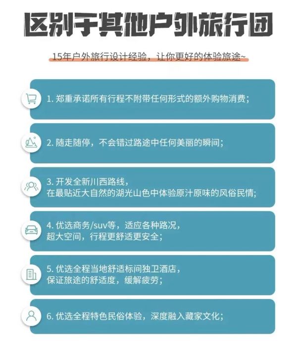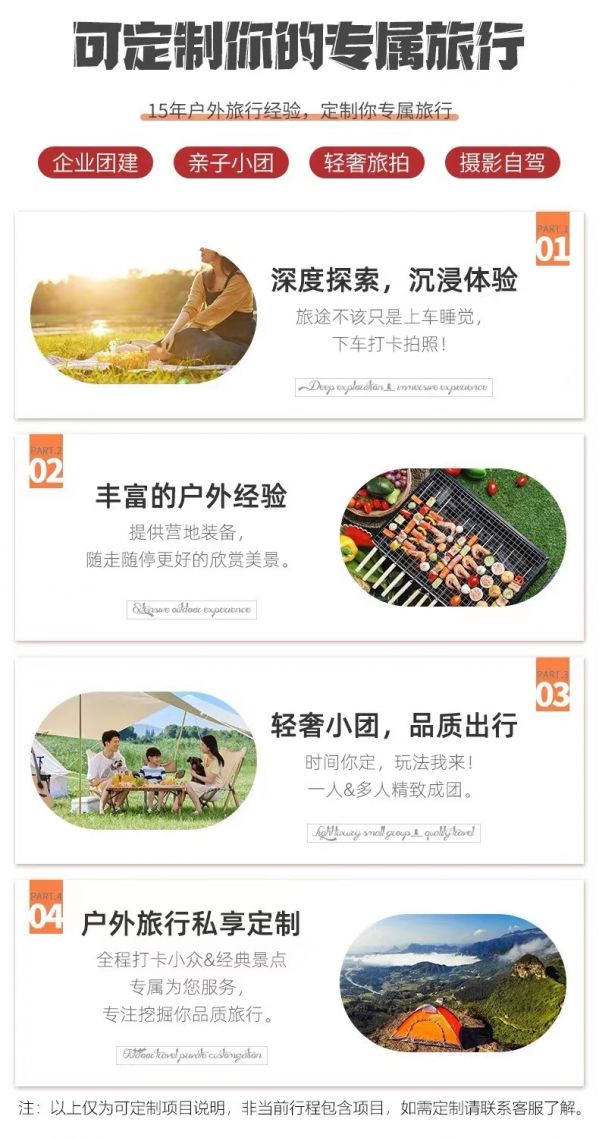 私人訂制:我們業(yè)務(wù)范圍囊括了全國各大城市,川西、西北、新疆、西藏,在路上永遠(yuǎn)有我們的身影。我們將為每一個有定制需求的你策劃出獨屬于自己的完美旅行。