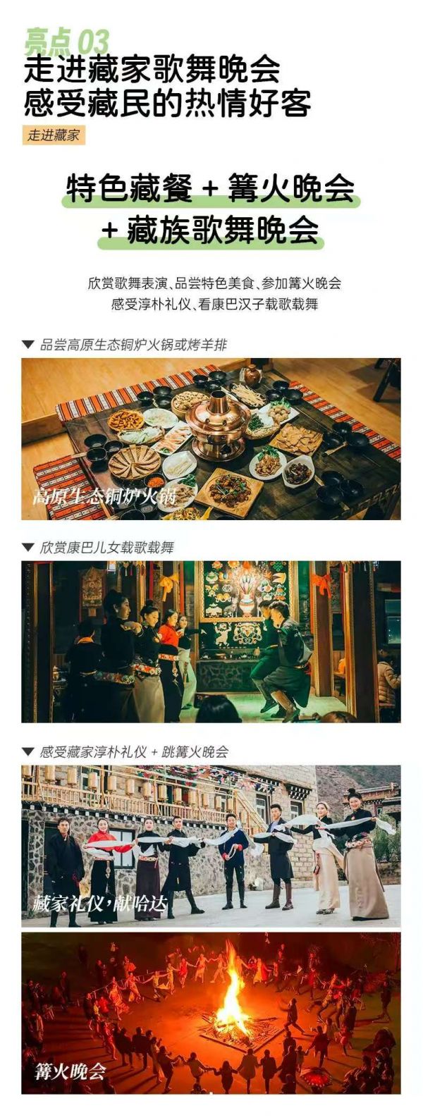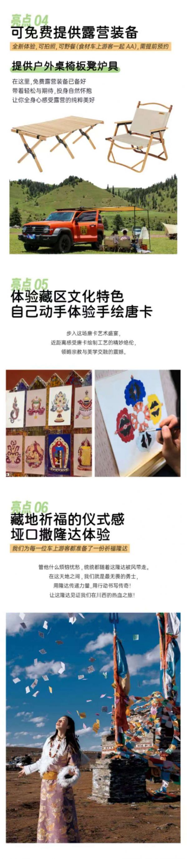 無(wú)人機(jī)+單反旅拍(底片全送+9張精修照片+1條精剪視頻),底片全程不低于40張,無(wú)人機(jī)視頻不低于3條(全車(chē)人拍攝旱地拔蔥視頻,晚上領(lǐng)隊(duì)帶大家星空拍攝);贈(zèng)送藏服旅拍(6張底片+3張精修),全場(chǎng)衣服通選(除了三款羊皮襖)+精妝+精造;隨車(chē)便攜式氧氣瓶每人2瓶、旅行三寶1套/人、撒隆達(dá)1份;隨車(chē)配備礦泉水、急救包、指尖血氧儀;贈(zèng)送特色土火鍋+篝火晚會(huì)+藏族歌舞表演晚會(huì);可免費(fèi)提供露營(yíng)桌椅板凳爐具,可以野餐(食材車(chē)上游客一起AA),需提前預(yù)約;體驗(yàn)藏區(qū)文化特色-畫(huà)唐卡;