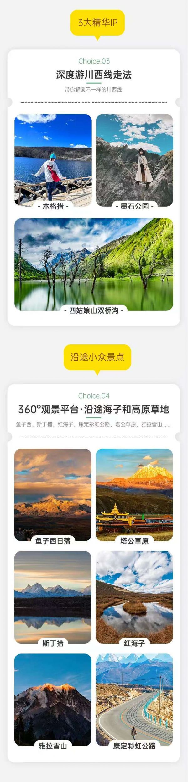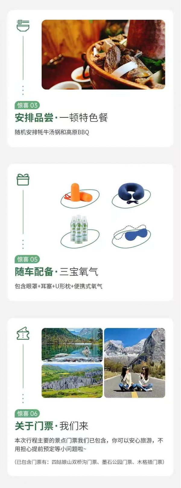 初到高原,建議緩步行走,適應(yīng)高原氣候,尊重少數(shù)民族風(fēng)俗習(xí)慣。因雙橋溝有限流要求,如遇票滿(mǎn),我們將更換安排海子溝和長(zhǎng)坪溝的門(mén)票,以上兩個(gè)景點(diǎn)也同屬四姑娘山。