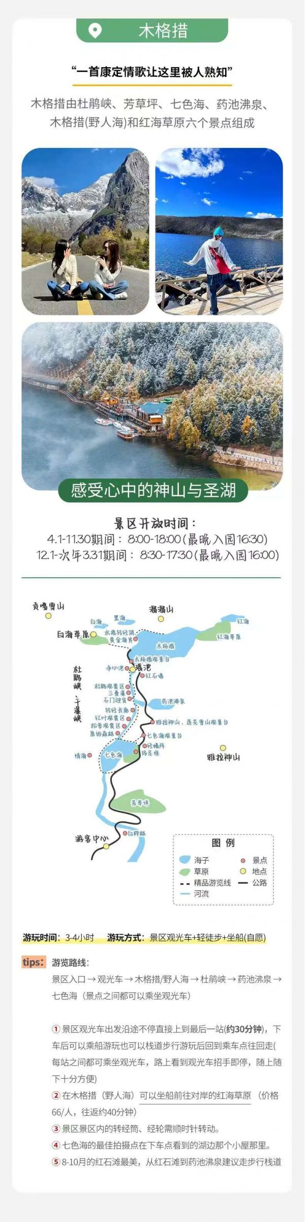 前往木格措景區(qū),大概游玩3-4小時(shí)左右,景區(qū)內(nèi)除可觀賞”臥虎觀月”、“石佛鎮(zhèn)?!钡壬骄巴猓诟鱾€(gè)季節(jié)的不同時(shí)辰還可觀賞到“雙霧墜?!薄ⅰ澳靖裣φ铡?、“木格晨曦”、“木格潮汐”和迭瀑飛泉等云、霞、霧、水奇景,海濱珍珠沙灘可享沙浴、日光浴之樂(lè)。