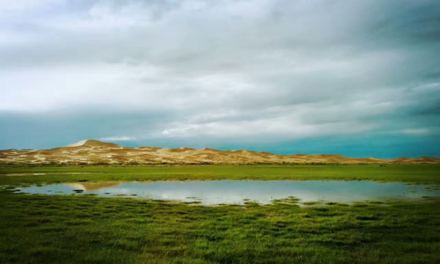 經(jīng)過小半程的徒步,會遇到一座極高的沙丘,翻越沙丘后豁然開朗。你會驚訝于沙漠的洪荒世界居然有如此的世外桃源,寧靜的湖泊被浩浩蕩蕩的綠洲包圍著,湖畔生長著沙漠腹地極罕見的小樹林,生機(jī)盎然。