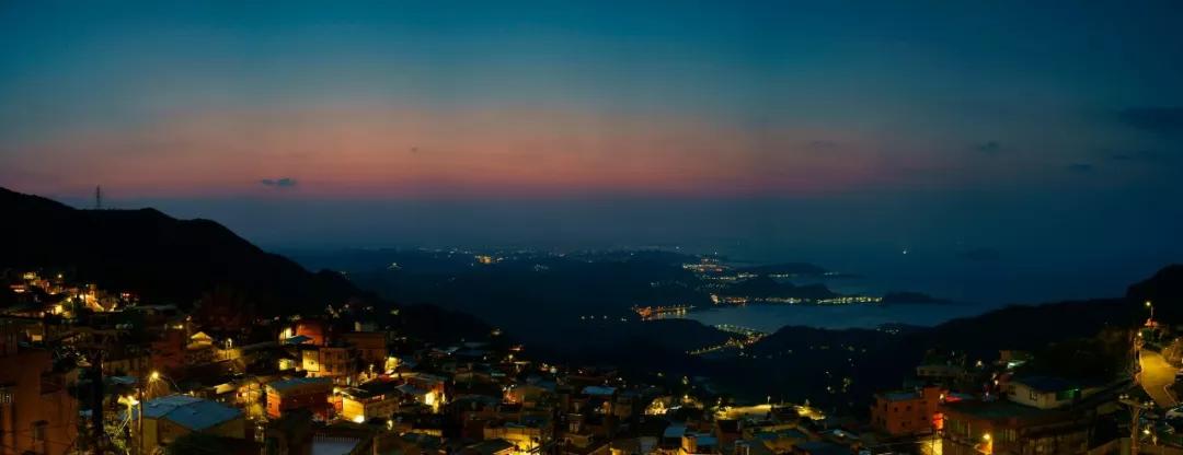 除了沿著巷子體會這獨一份的曲徑通幽之外,俯瞰視角的九份,也非常美,老街燈火盞盞,不遠處的海面上漁火星星點點。