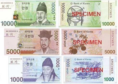 貨幣的基本單位 - 元(WON)。 貨幣種類 - 紙鈔有 1,000 、 5,000 、 10,000韓元 3 種。 硬幣有 1 、 5 、 10 、 50 、 100 、 500 元 6 種。 美元和旅行支票可在機場內(nèi)的銀行、飯店內(nèi)的兌換窗口、市中心的一般銀行兌換。