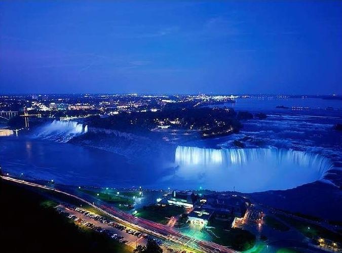 尼亞加拉瀑布在白天看波瀾壯闊,入夜后則是另一番景象。在紅日西墜時,珠幔般的水花,在夕陽映照下,七彩虹霓,燦然入目。當(dāng)夜幕降臨之際,瀑布水色漸顯灰黯,此時圍繞著瀑布周圍的巨型聚光燈,突然齊放綠光,使原已灰黯的瀑布,頓時大放光彩,變得晶瑩透澈,熠熠生輝。尤其從塔頂望出去,到處是五顏六色的燈光,瀑布的景象比白天更加多姿多彩。在夏季的每個星期五,尼亞加拉瀑布上空還有焰火表演。