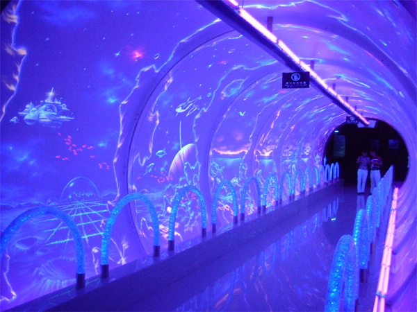 國(guó)內(nèi)絕無僅有的熒光純手工壁畫,由日本著名熒光畫大師遠(yuǎn)山先生花了3個(gè)多月畫成,價(jià)值超三百萬元。整個(gè)壁畫描述了海洋形成、發(fā)展過程和未來的遐想,即海洋的昨天、今天和未來,在這里你可以完全放飛你的想象;該壁畫另一奇妙之處:如果關(guān)閉熒光燈,壁畫會(huì)變成一面白墻,什么也不見,但是打開熒光燈后,畫面栩栩如生,層次分明,你不得不驚嘆大師的高超技藝。