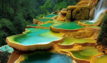 這一片景觀,還有緊傍森林的明鏡倒影池、掩映于杜鵑花叢間的婆蘿彩池和擁有彩池500多個(gè),鈣化景觀中色彩最為豐富的爭艷池。