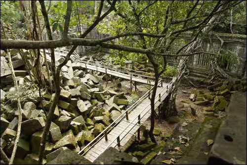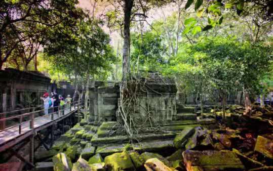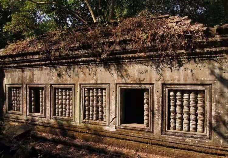 崩密列的護(hù)城河長(zhǎng)1.2公里,寬0.9公里,它和吳哥寺幾乎一樣大的規(guī)模,但依然被叢林嚴(yán)密包裹著。由于比較荒僻,所以很多浮雕和塑像已被掠奪,但寺廟的神秘氣氛仍舊在森林深處彌漫。