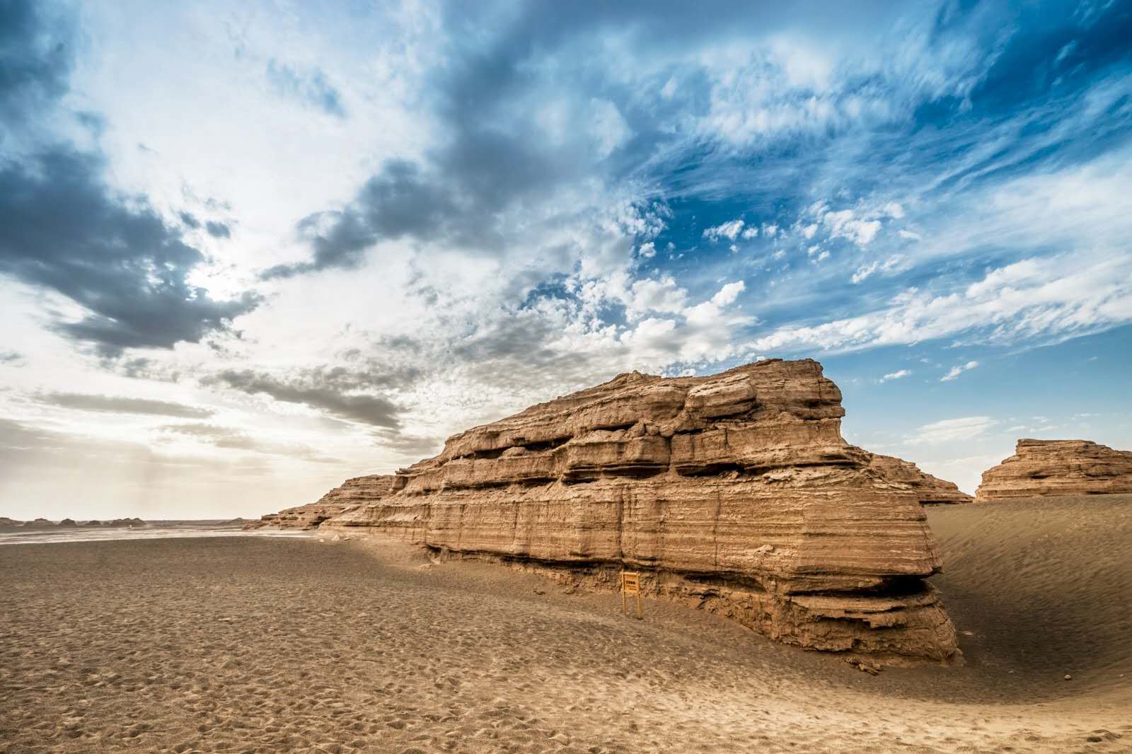 據《辭海》解釋“雅丹——維吾爾語,原義為具有陡壁的土丘,是干燥地區(qū)的一種風蝕地貌”。據玉門關西75公里處,有一處典型的雅丹地貌群落,東西長約25公里,南北寬約4——5公里,敦煌人俗稱魔鬼城,因此暫且將其定名為“玉門關雅丹魔鬼城”。這片雅丹地貌群落遠遠超出了辭書中所定義的規(guī)模和形態(tài),其個體和整體規(guī)模之大,形態(tài)之奇異實屬舉世罕見。其高度,低的四五米,高的有二三十米,長寬由十幾米到幾百米不等;其整體,象一座中世紀的古城。這座特殊的城市,有城墻、街道、大樓、廣場、教堂、雕塑;其形象生動,惟妙惟肖,令世人瞠目。世界許多著名建筑都可以在這里找到它的縮影,北京的天壇,西藏的布達拉宮,埃