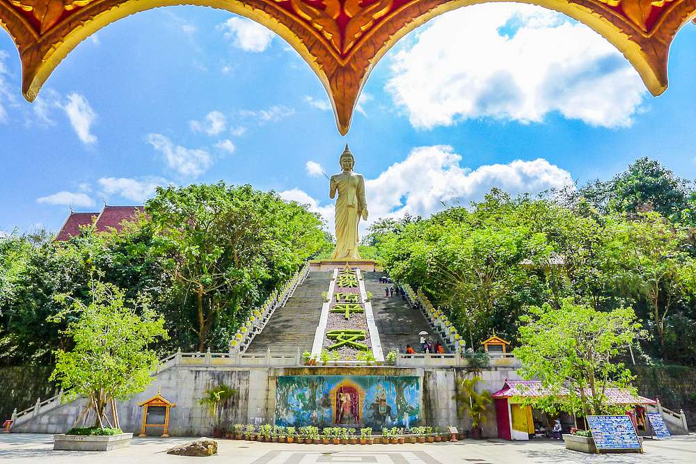 勐泐大佛寺位于云南省西雙版納傣族自治州州府景洪市城郊,按照國家AAAA級景區(qū)標準打造。勐泐大佛寺是在古代傣王朝的皇家寺院“景飄佛寺”的原址上恢復重建的,“景飄佛寺”是傣族歷史上一位名叫撥龍的傣王為紀念病故的王妃南紗維扁而修建。王妃一生信奉佛法,所以每逢節(jié)日傣王就親臨寺院,舉行大型法會,以紀念愛妃同時弘揚佛法。據(jù)史料記載:“景飄佛寺”始建于明代,是南傳佛教象征十二版納的標志性建筑之一,也是版納佛教活動的重要場所。該建筑在佛歷2883年(即公元1848年,清咸豐年間)戰(zhàn)爭中被毀,距今已有169年。佛寺于2005年開始重建,于同年3月9日舉行了大型的土地開光儀式,于2005年5月9日舉行了盛大的大殿奠基開光儀式,在大殿施工時,挖掘出大量的銀幣、銀盒、佛教法事用品等。佛寺于2007年11月3日一期工程竣工,竣工之時,邀請了海內(nèi)外108位高僧為佛寺舉行了盛大的開光大典,州內(nèi)外參加開光大典的各民族佛教信眾達65萬人之多。 占地面積400畝,佛寺依山而建,落差達122.8米,呈坐佛形,為國內(nèi)外所獨有。景區(qū)以佛祖釋迦牟尼的生平及佛寺活動為主線,巧妙融入到景觀及建筑群體中,充分展示南傳佛教的歷史與傳統(tǒng)文化色彩。從萬佛塔前廣場俯視景洪市區(qū),旖旎的熱帶風光盡收眼底。