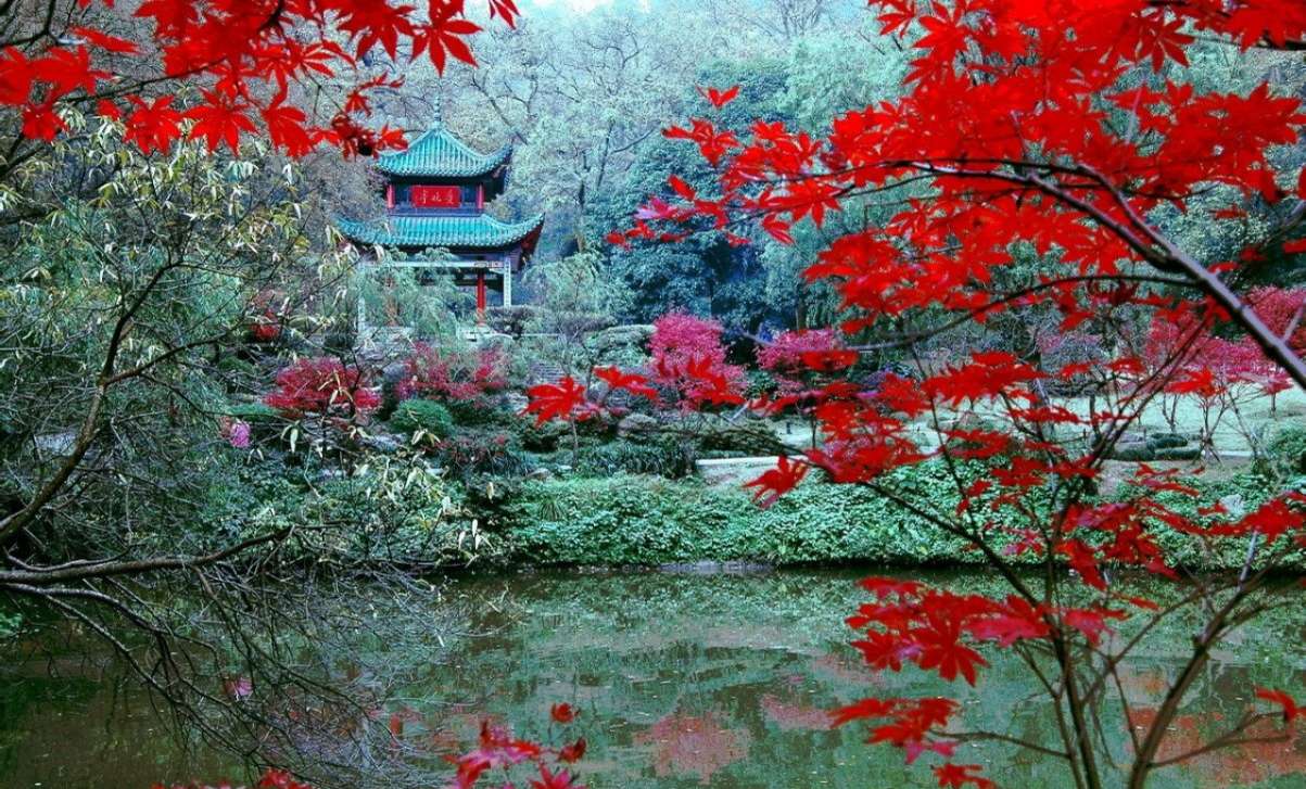 袁枚到了清風(fēng)峽,只見這里三面環(huán)山,楓葉紅的像火,中間開闊處有座亭子,石柱子,琉璃瓦,飛檐高挑。亭子的匾額上寫著“紅葉亭”三個(gè)大字,柱子上刻了一副對(duì)聯(lián):“山徑晚紅舒,五百夭桃新種得,峽云深滴翠,一雙馴鶴待籠來?!痹犊戳藢?duì)聯(lián),不住點(diǎn)頭,望望匾額,好像想說什么,又沒說出口來。他離開了清風(fēng)峽,參拜了麓山寺,觀賞了白鶴泉,登上了 云麓宮,才興盡下山。