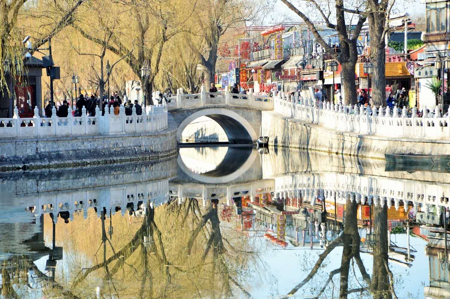 元代營建新大都后這里已是船泊必經(jīng)之處,兩岸商事繁華,又是風景勝地。遼、金時代雖是郊外,數(shù)公里長的水系兩岸也應(yīng)有便橋方便來往。明代史籍已有明確的記載。解放初期,當我們站在銀錠橋頭平目西望,遠處藍天下的青山綿延起伏,湖邊搖曳的柳絲楚楚動人,猶如掛在空中美麗的巨幅圖畫,每當夕陽西下,金色的余輝從山后撒播在湖面上,微波粼粼,金光閃閃,迷人的湖光山色令人流連忘返,可惜后來的煙囪和高樓大廈嚴重地破壞了京城這難得的獨特景觀,但愿這遺憾和教訓(xùn)不再發(fā)生。