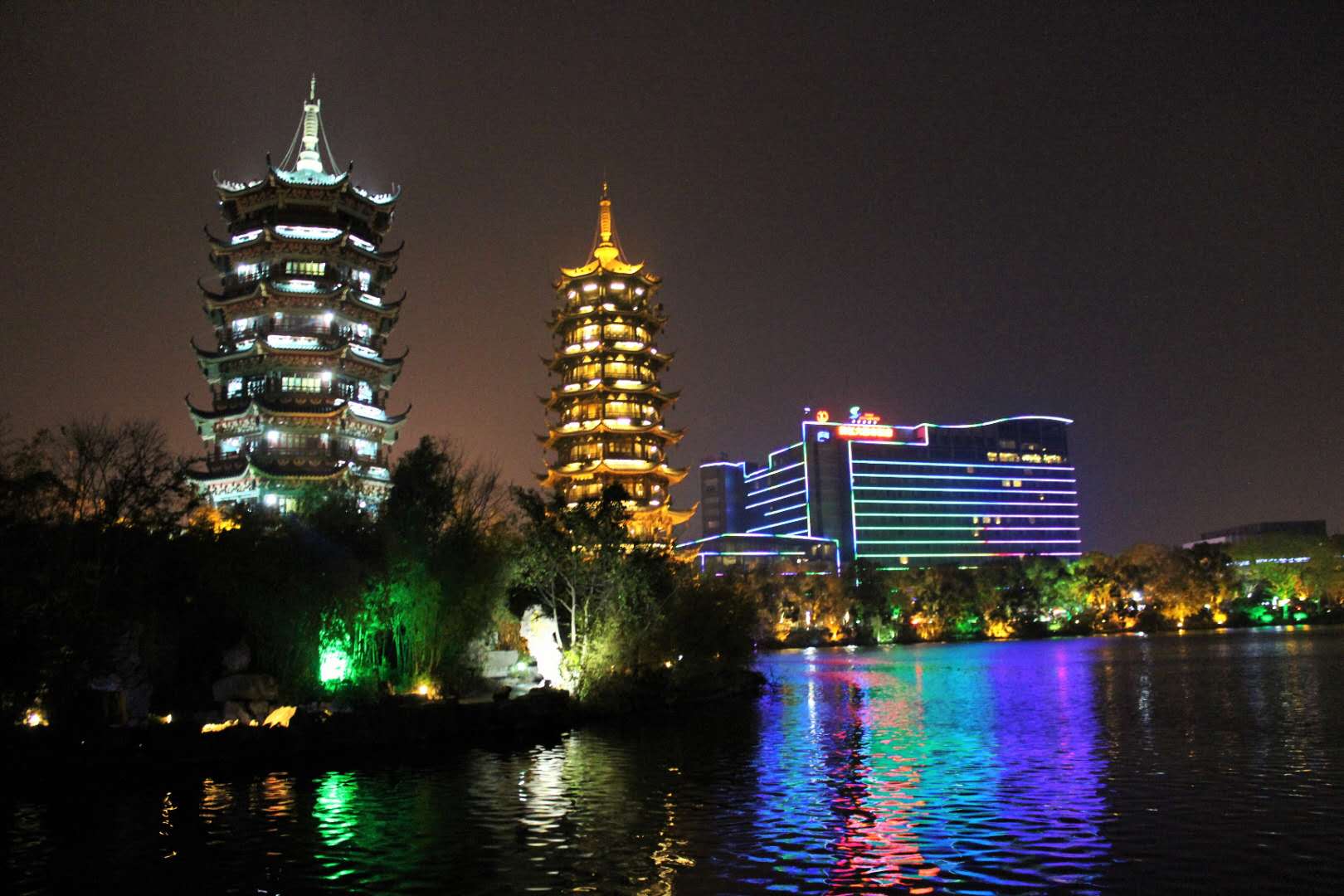 日月雙塔坐落在杉湖中,日塔為銅塔,位于湖中心,高41米,共9層,月塔為琉璃塔,高35米,共7層。兩塔之間以18米長(zhǎng)的水下水族館相連。版權(quán)所有山東聊城聊之旅國(guó)際旅行社有限公司,轉(zhuǎn)載必究!銅塔所有構(gòu)件如塔什、瓦面、翹角、門拱、雀替、門窗、柱梁、天面、地面等均由鋼材鑄鍛而成,并以精美的銅壁畫裝飾,整座銅塔涵蓋了三項(xiàng)世界之最--世界上最高的銅塔,世界上最高的銅質(zhì)建筑物,世界上最高的水中塔。日月雙塔是桂林兩江四湖夜景重要的景色之一。