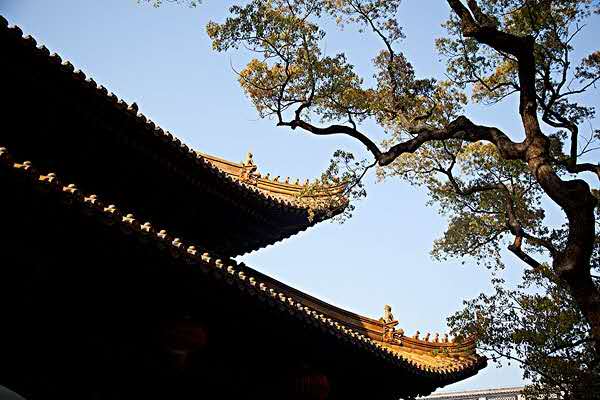 天王殿。亦稱金剛殿,面寬五間,進(jìn)深四間,重檐歇山。進(jìn)門迎面是一彌勒菩薩,光首、笑臉、袒胸、盤坐,一手拿一只布袋。據(jù)說他能將世人一切苦難裝入布袋之中。佛像兩旁有一副對(duì)聯(lián):“慈顏含笑笑天下之可笑之人,大腹可容容世間難容之事”,以勸人們慈悲大度為懷,用樂觀態(tài)度對(duì)待風(fēng)雨變幻的生活。彌勒菩薩后面的塑像是韋馱菩薩,昂然挺立,手持寶杵,據(jù)傳韋馱是神將之首,常于東、南、西三州巡游,守護(hù)伽藍(lán),屬護(hù)法神。兩旁的四大天王宛如四名衛(wèi)士在維護(hù)法門,他們是東、南、西、北四個(gè)方面的天王,各自手里拿著法器。殿后有香樟8株,直徑0.8-2米多,植茂蓋庭。