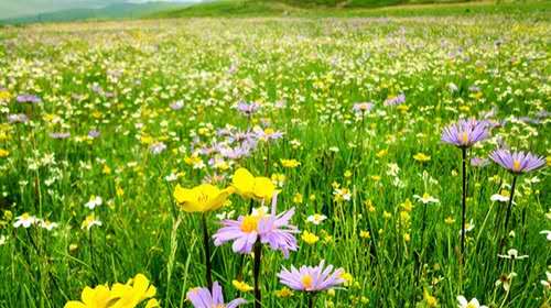 花湖位于四川若爾蓋和甘肅郎木寺之間的213國道旁,是熱爾大壩草原上的一個天然海子。熱爾大壩是我國僅次于呼倫貝爾大草原的第二大草原,海拔3468米。花湖經(jīng)典的時間是在五六月份,湖畔五彩繽紛,好像云霞委地,而湖中則開滿了水妖一樣的絢麗花朵,這種植物看起來平淡無奇,在雨水充沛的八月把純藍(lán)的湖水染成淡淡的藕色,時深時淺,像少女思春時低頭的一抹酡紅。