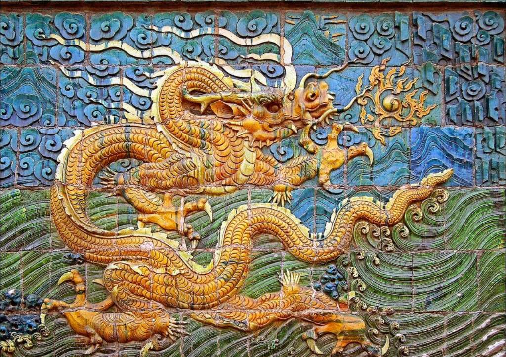 每當朝陽升起,金光萬道,九龍壁涂上了一層耀眼的光輝,巨龍仿佛沖破霧靄,騰身游動起來。隨著晨霧的消散,九條龍更加絢麗,萬縷金光在龍身上閃耀,龍身抖動,昂首擺尾,盤繞彎曲,在海波上翻騰,在流云中穿行,猶如真龍再現,宛然如生。