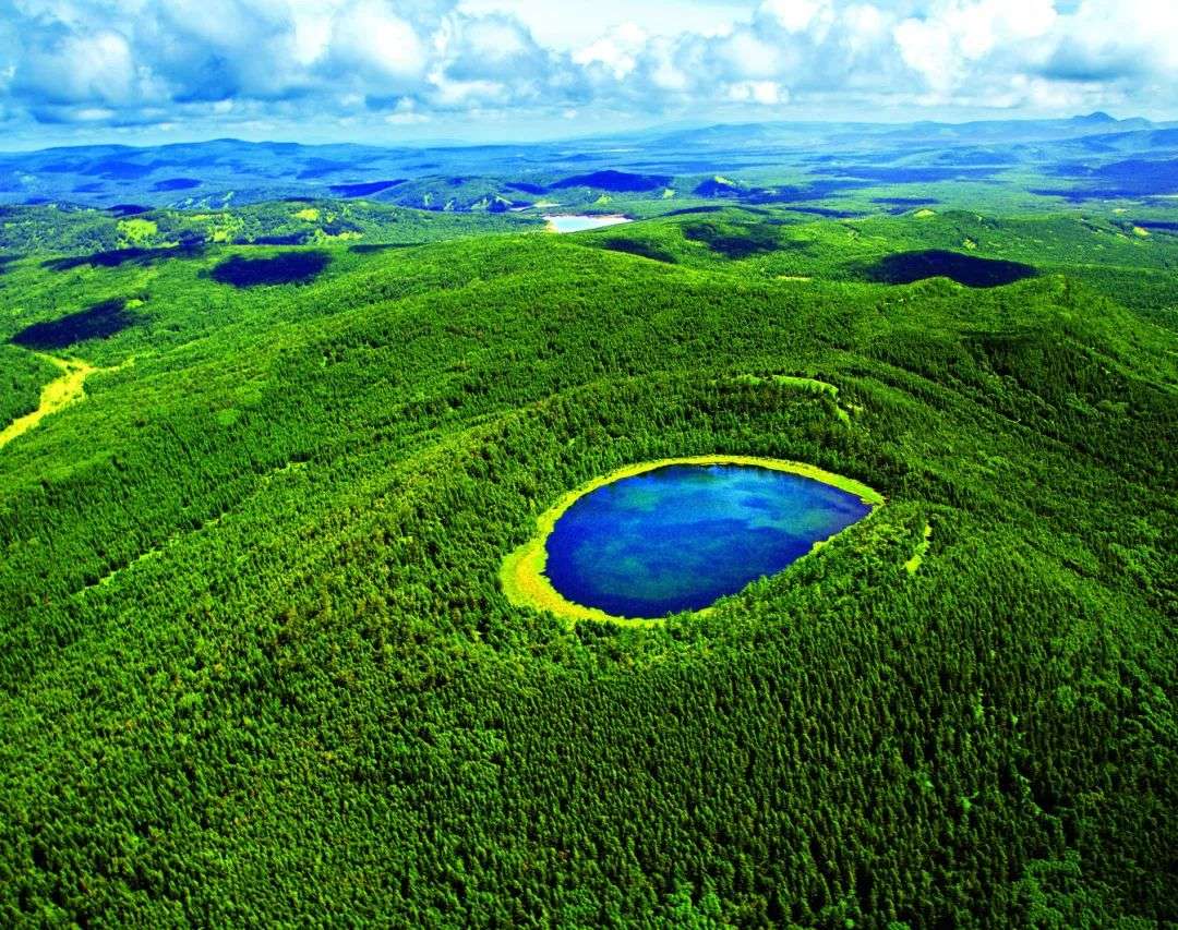 阿爾山天池,位于阿爾山市東北74公里的天池嶺上,由火山噴出物落在噴火口周圍形成一道環(huán)狀圍墻,中間形成圓形凹坑,多年積水而成。