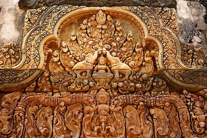 女皇宮采用高棉特有的紅土建造,色彩極為艷麗。含有大量水分的紅土既便于運輸、建筑,也利于雕刻復雜細膩的圖案。而建筑建成后,經(jīng)過風干,就變得異常堅硬,千年不壞。