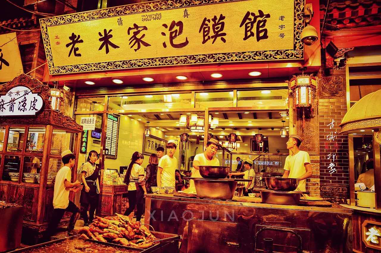晚上的回民街有著與白天不同的精彩,整條街被濃厚的市井氣息籠罩,道路兩旁遍布掛著電燈、汽燈的各種攤鋪,主要販賣糕餅、干果、蜜餞、小吃。這些小攤后面則是許多經(jīng)營當(dāng)?shù)仫L(fēng)味小吃的飯館,人多時不光店里人