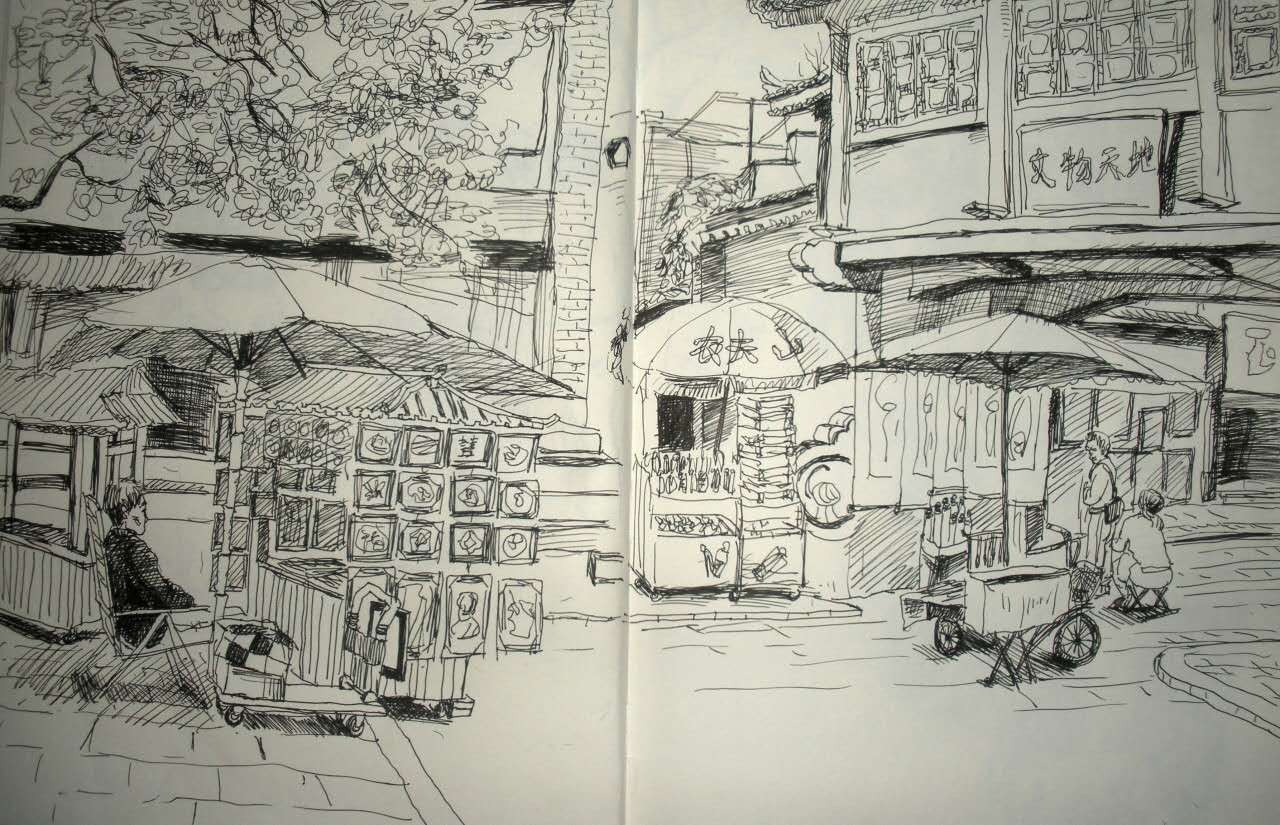 從南大街走到這條街上,忽然好像一下子安靜了下來。路兩邊,高大的槐樹后面,紅漆格子門半開著,大大小小的湖筆從門檐上面垂下來,后面是一張怡然自得的臉,表情似曾相識(shí)。青石板的路面緊貼著鞋底,松動(dòng)的地方發(fā)出清脆的烏烏聲。潑墨山水掛在城墻的青磚墻上,斑駁的陽光灑在上面,隨風(fēng)輕輕抖動(dòng)。
