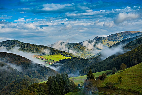 南部黑森林,從弗賴堡到德國和瑞士的邊境。樹林不再相連成一大片,風(fēng)光逐漸接近瑞士,山間的草地逐漸增多,樹林間的山坡被開辟成草地牧場。