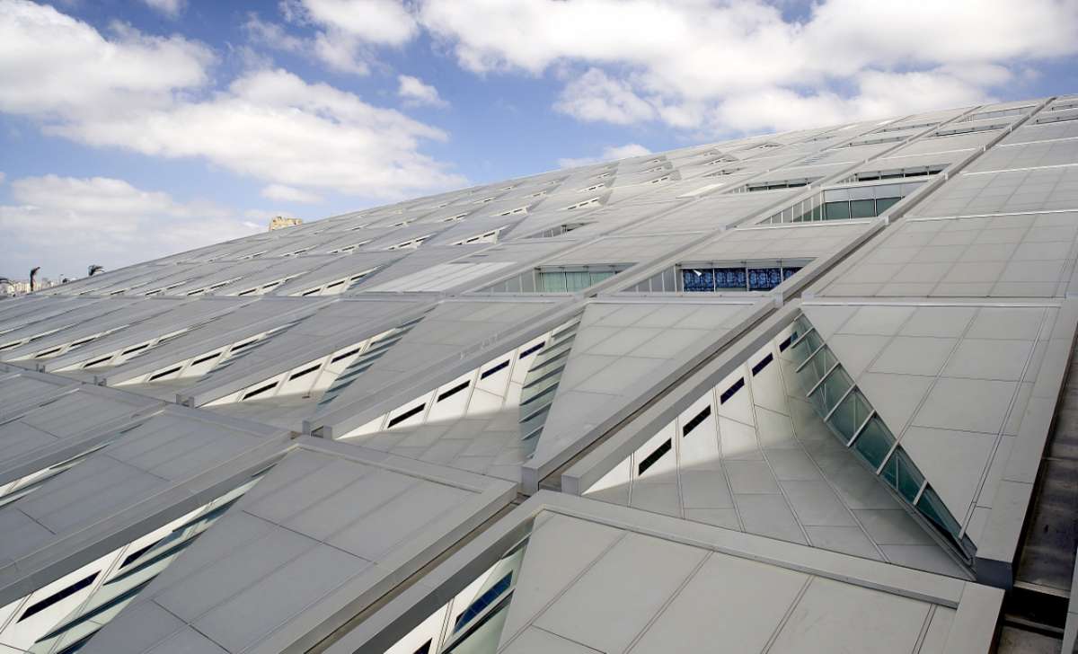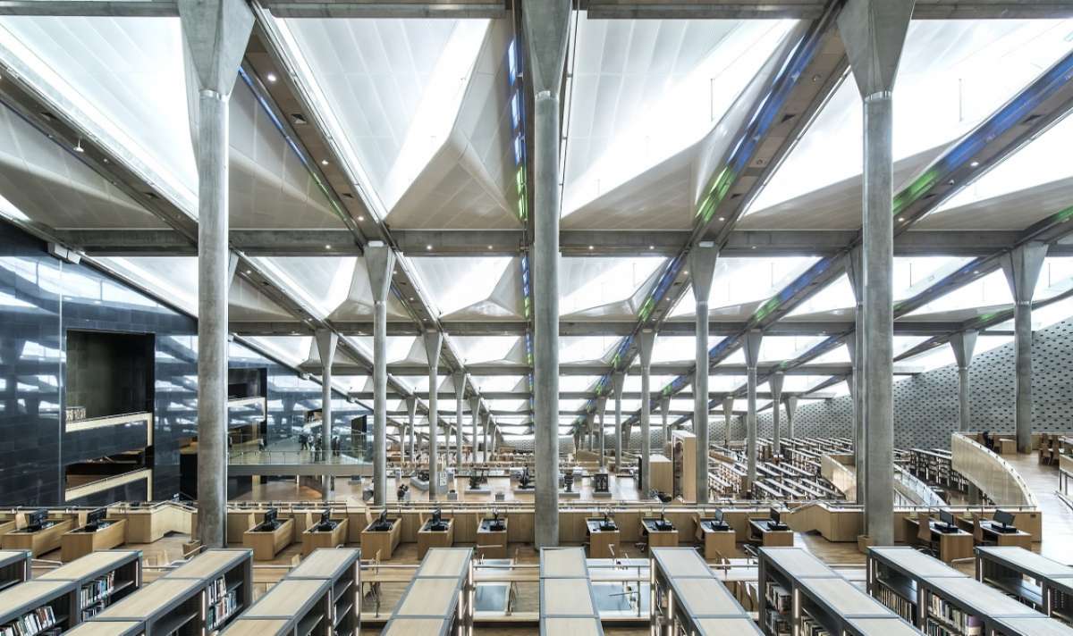 今天的圖書館達(dá)到了既現(xiàn)代又有厚重歷史感的目的。它向地中海傾斜的外部圓形建筑據(jù)稱是既懷念古時(shí)的圓形港口,又聯(lián)想到宇宙的模樣。鋼架玻璃的屋頂,和柱頂?shù)乃睦馔哥R使透入的光線彌散,且隨日光的移動(dòng)而不斷變化。圖書館的墻體由2米寬1米高的巨石建成,6300平方米的石頭墻上刻滿了阿拉伯文字、圖案、符號(hào),此外還有音樂和數(shù)學(xué)符號(hào),以及世界各種文化的文字符號(hào);這些圖案均系手工鑿刻而成。館內(nèi)寬敞明亮,確有傳統(tǒng)圖書館的風(fēng)范。