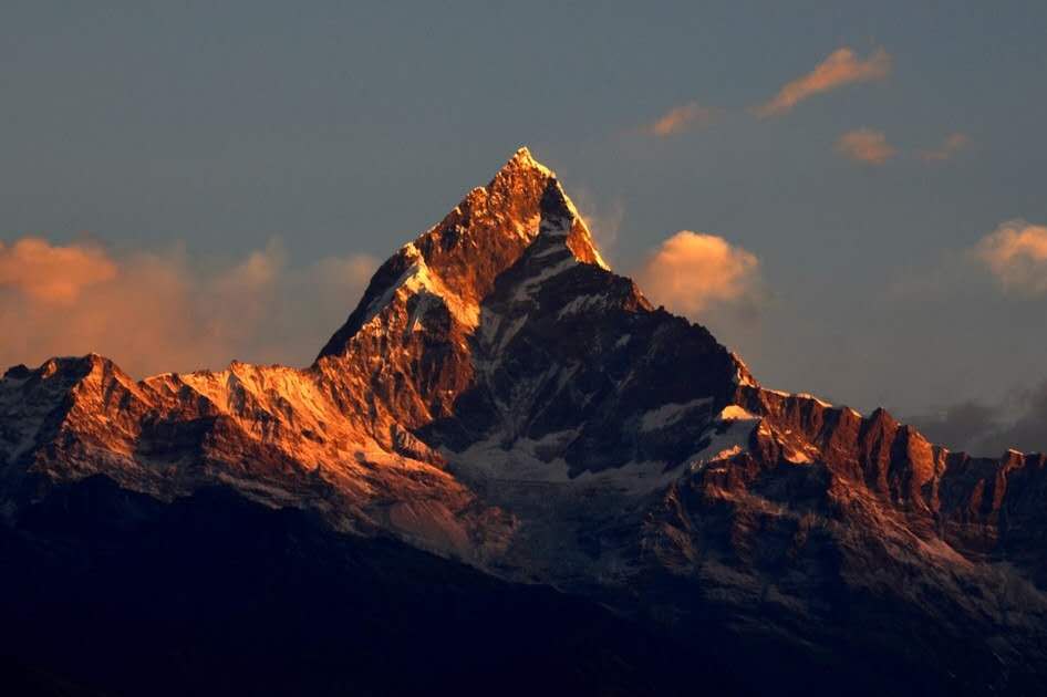 魚尾峰雖然不是尼泊爾最高的山峰,但卻成為尼泊爾的標志。從波卡拉的費娃湖附近,可以看到這座圣山和周圍峰群,突出于較低的山巒之上。