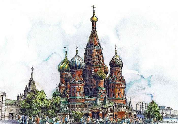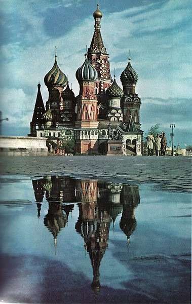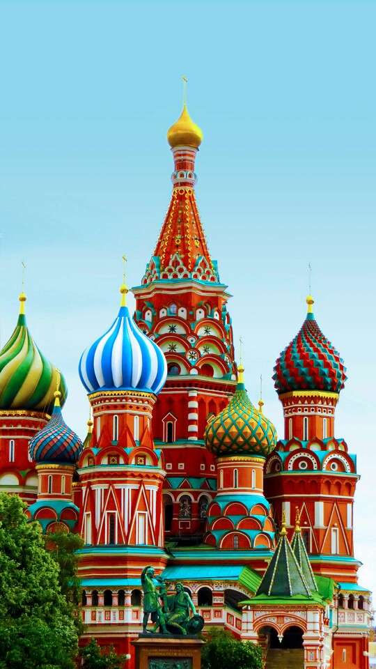 圣瓦西里大教堂于1553-1554年為紀念伊凡四世戰(zhàn)勝喀山汗國而建(由7個木制小教堂組成),并于公元1555年—公元1561年奉命改建為9個石制教堂,造型別致,多奇異雕刻,主臺柱高57米,為當時莫斯科最高建筑。